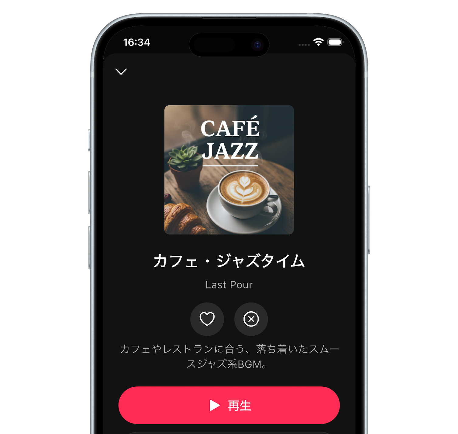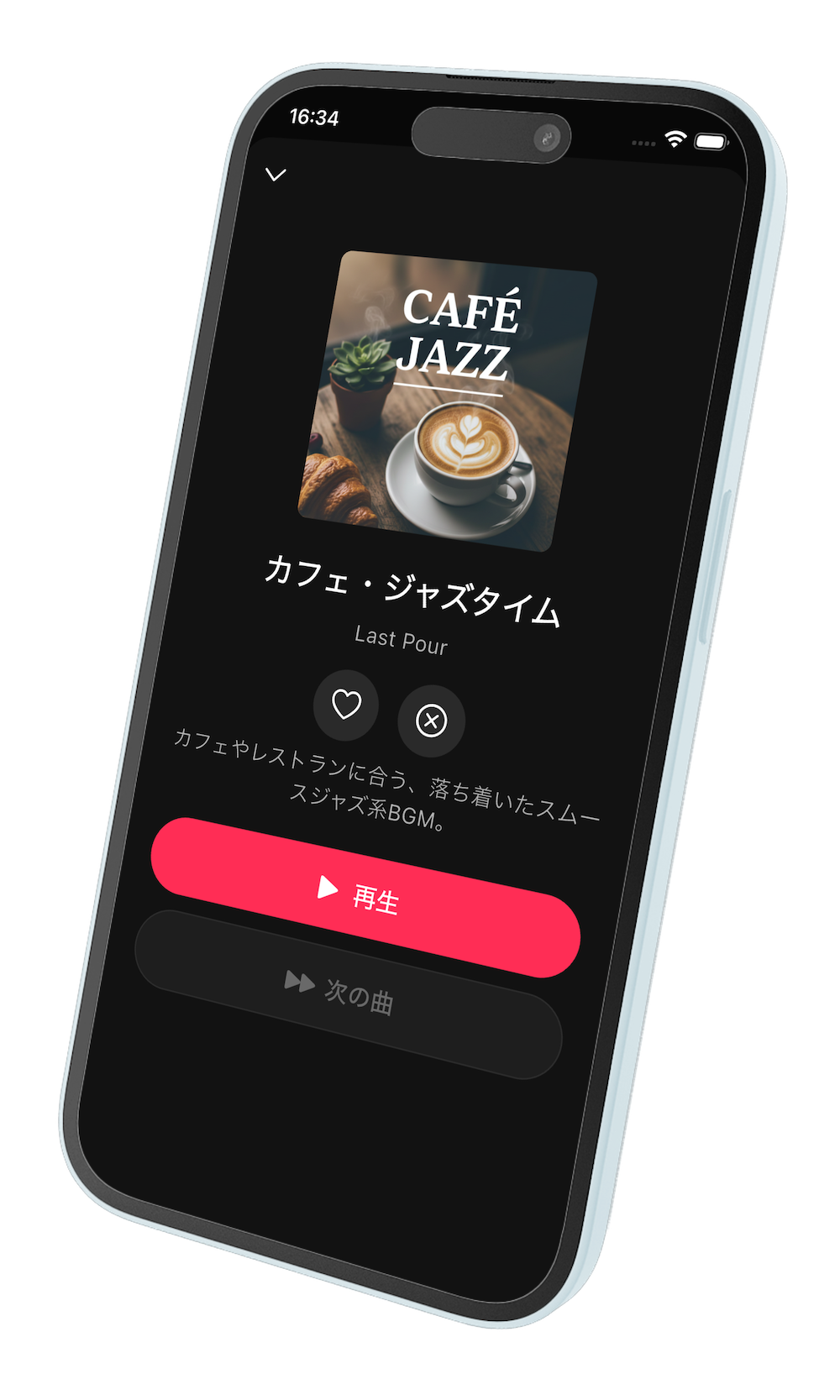 お店の業種・雰囲気に合わせてプレイリストを選ぶ。 自動で再生が続き、店内BGM運用が始まります。