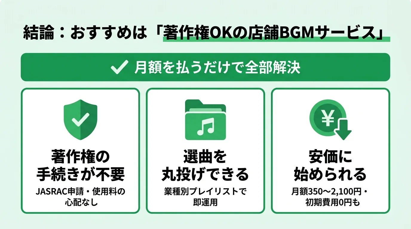まとめ|店舗BGMは「著作権OKの店舗BGMサービス」が正解