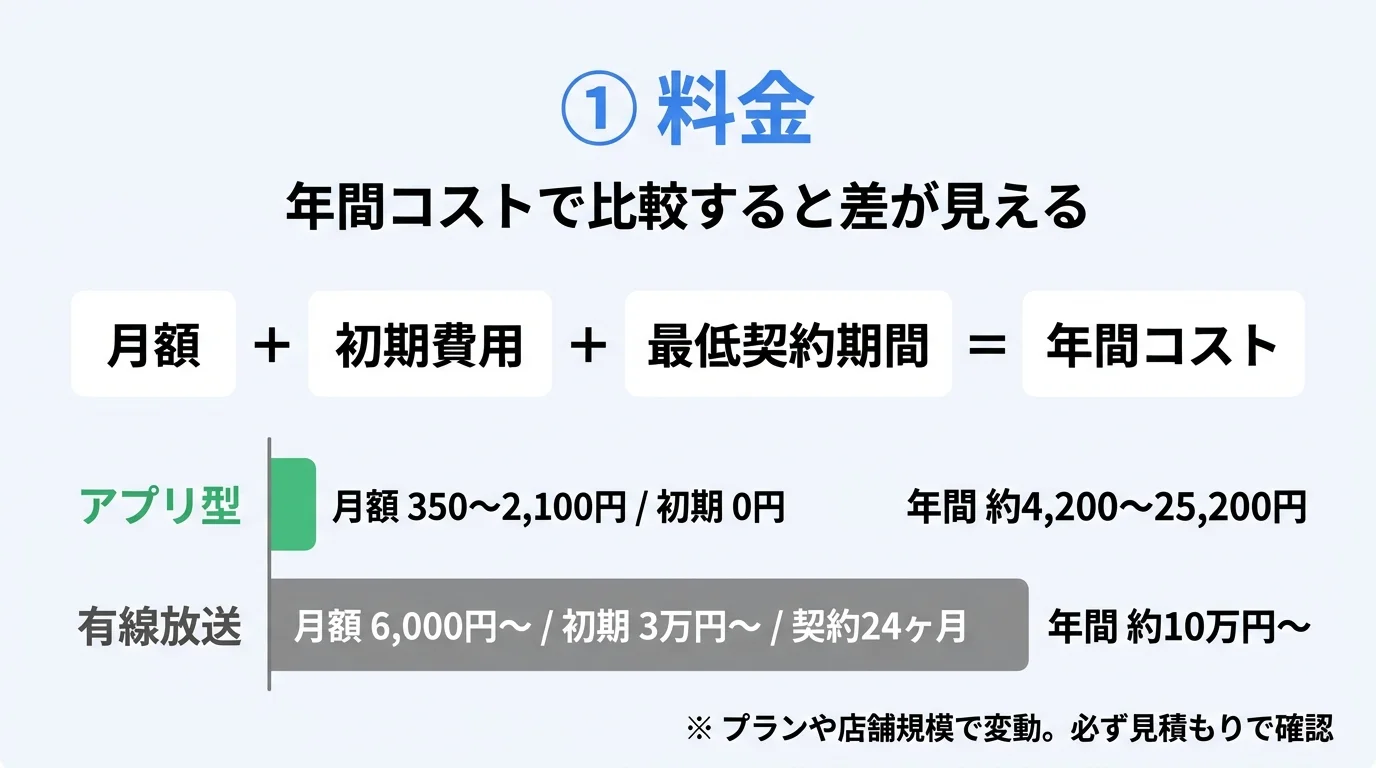 月額料金だけでなく、初期費用・最低契約期間も合算して年間コストで比較しましょう。アプリ型は月額350〜2,100円+初期0円、有線放送は月額6,000円〜+初期3万円〜+契約24ヶ月と大きく差が出ます。