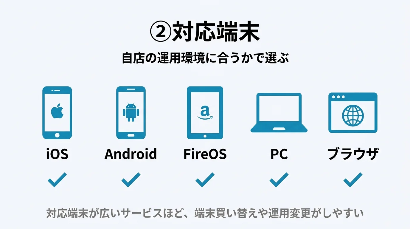 手持ちのiPhone・iPad・Androidでそのまま使えるか、店舗のPCやタブレットで使えるかを確認。対応端末が広いサービスほど、端末買い替えや運用変更がしやすくなります。