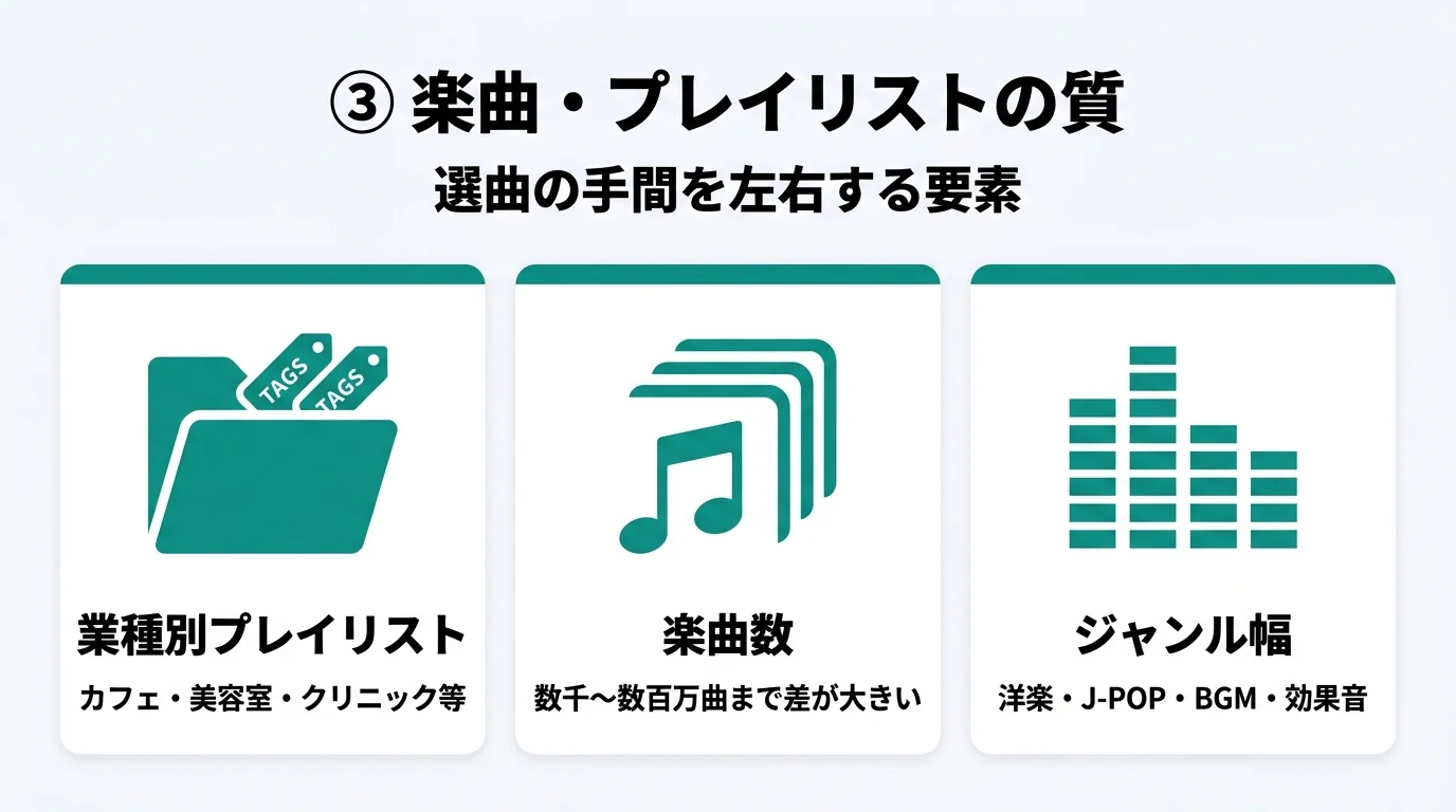 | 楽曲・プレイリストの質 | 業種別プレイリストの有無、楽曲数、ジャンル幅 |