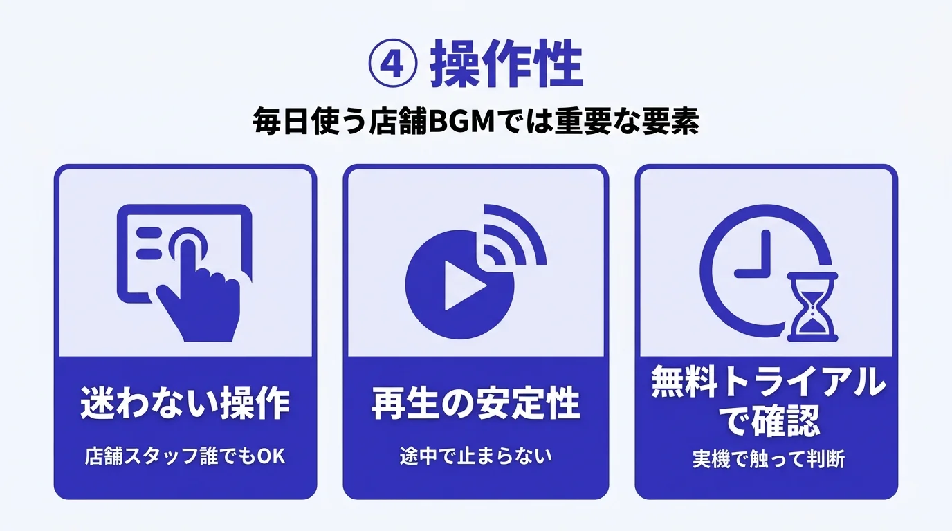 店舗スタッフ誰でも迷わず操作できるか、再生が途中で止まらないかは、毎日使う店舗BGMでは特に重要。無料トライアルで実機を触って確認するのが確実です。