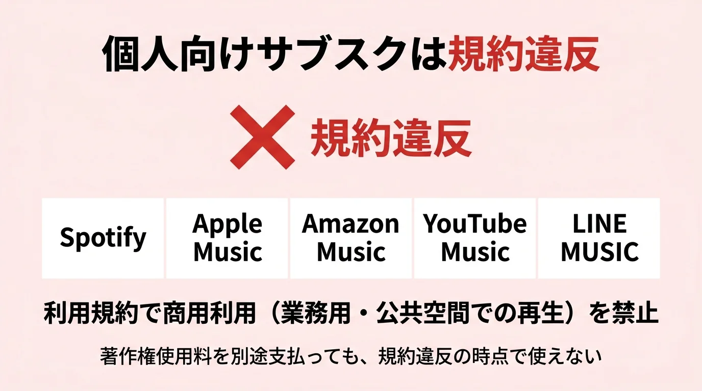 Spotify・Apple Music・Amazon Music・YouTube Music・LINE MUSICは、利用規約で商用利用(業務用・公共空間での再生)を明確に禁止しています。つまり「著作権使用料をJASRACに別途支払っていた」としても、サービスの利用規約に違反している時点で使えません。