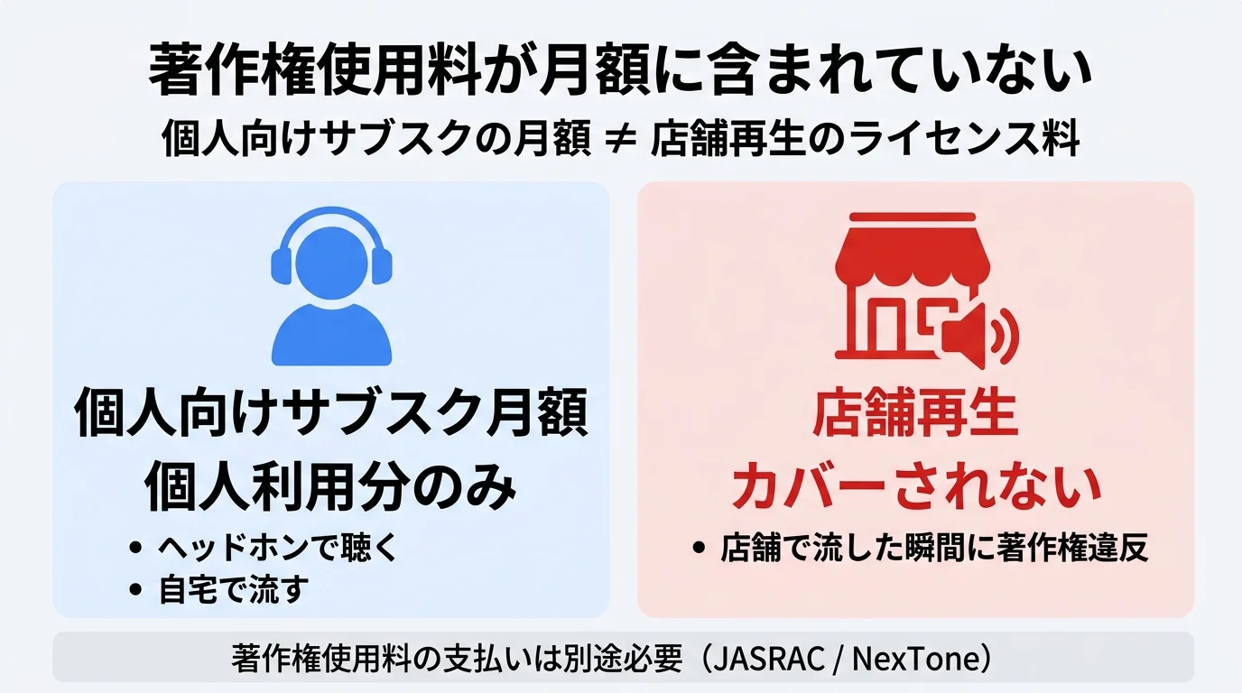 JASRACやNexToneが管理する楽曲を店舗で流す場合、著作権使用料の支払いが必要です。個人向けサブスクの月額料金は個人利用分しかカバーしていないため、著作権曲を店舗で流した場合著作権違反になります。