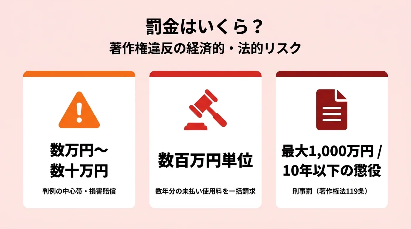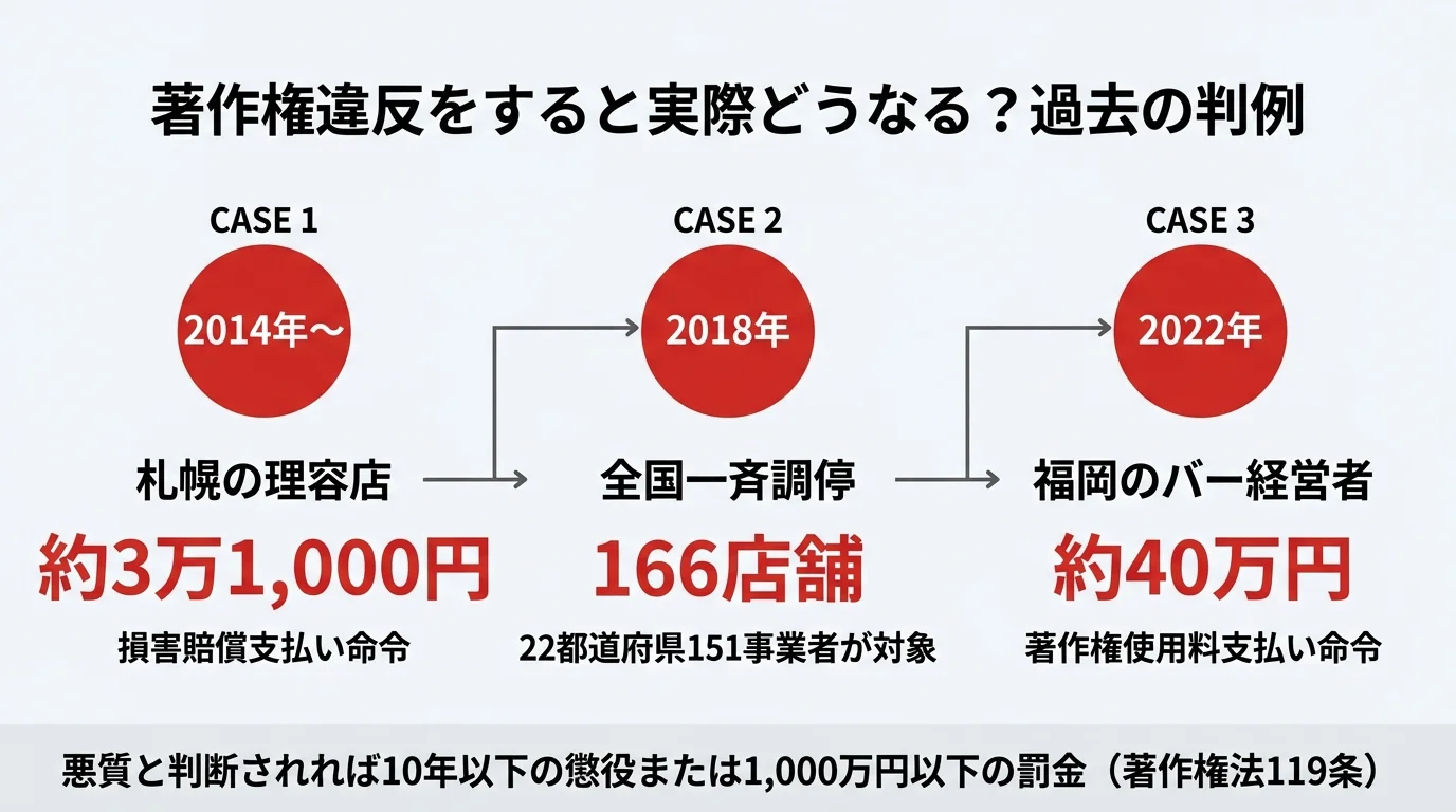 無許諾で著作権管理楽曲を店舗で流した場合、過去の判例では数万円〜数十万円の損害賠償が中心です。ただし開業時からさかのぼって未払い使用料を請求されるケースもあり、数年分一括で請求されると数百万円規模になる可能性もあります。最悪の場合は刑事罰(10年以下の懲役または1,000万円以下の罰金)の対象にもなります。