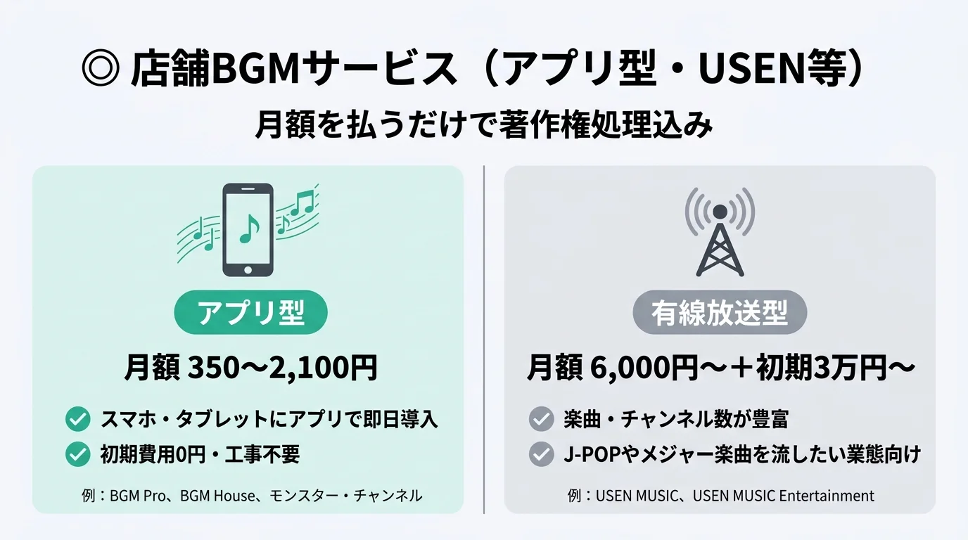 | ◎ 店舗BGMサービス(アプリ型・USEN等) | なし | ◎ | 著作権処理込み。アプリ型はスマホで即日導入、USEN等は専用機器設置 |