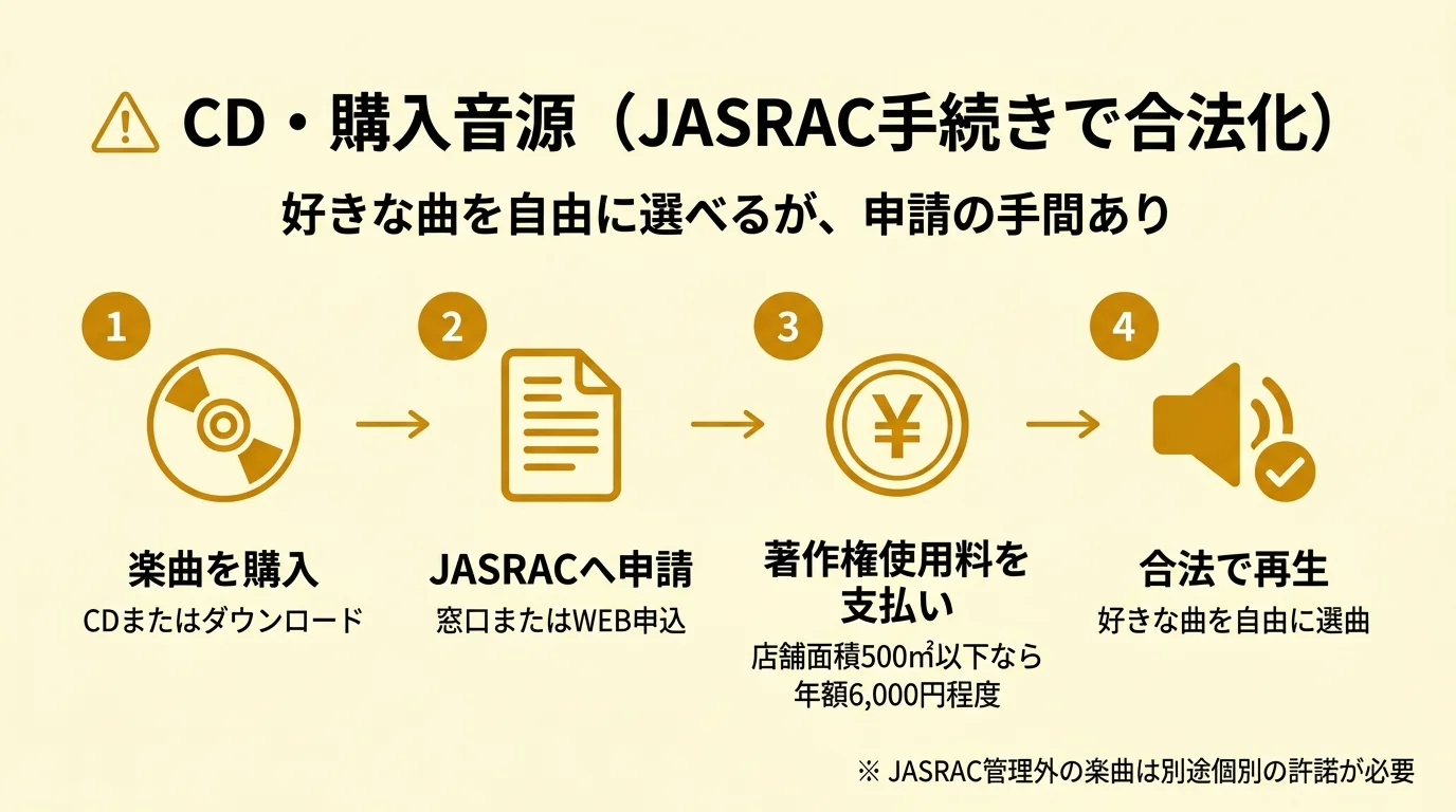 自分で購入したCD・ダウンロード楽曲を、JASRAC(および必要に応じてNexTone)に著作権使用料を支払って店舗で合法的に流す方法です。料金は店舗面積500㎡以下なら年額6,000円程度(+楽曲代)が目安。