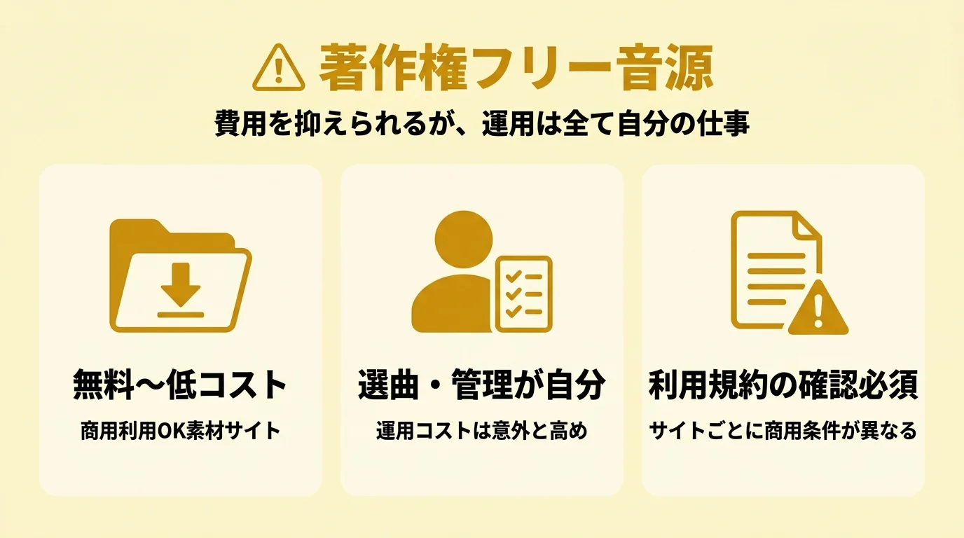 | △ 著作権フリー音源 | 低(要確認) | △ | 選曲・更新が全部自分の仕事 |