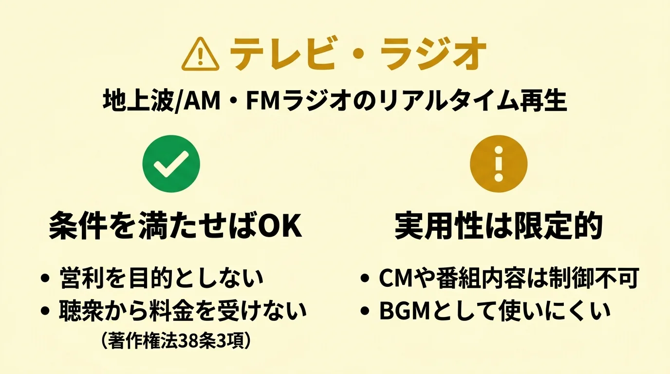 地上波放送とAM/FMラジオのリアルタイム再生は、営利を目的とせず、聴衆から料金を受けない条件を満たす場合にJASRACへの手続き不要と定められています(著作権法38条3項)。ただしCMや番組内容のコントロールができず、BGMとしての実用性は限定的です。