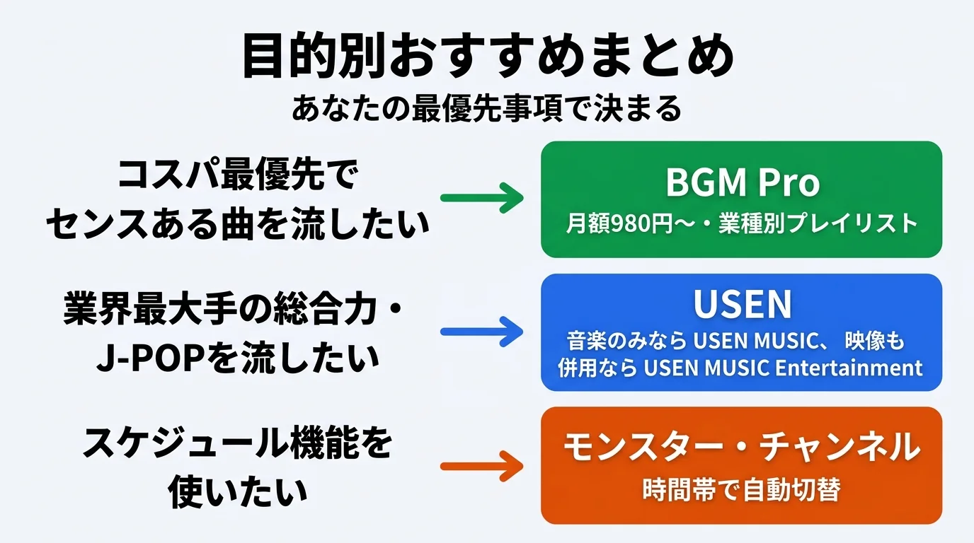 - コスパ最優先でセンスある曲を流したい → BGM Pro(月額980円〜・業種別プレイリスト)