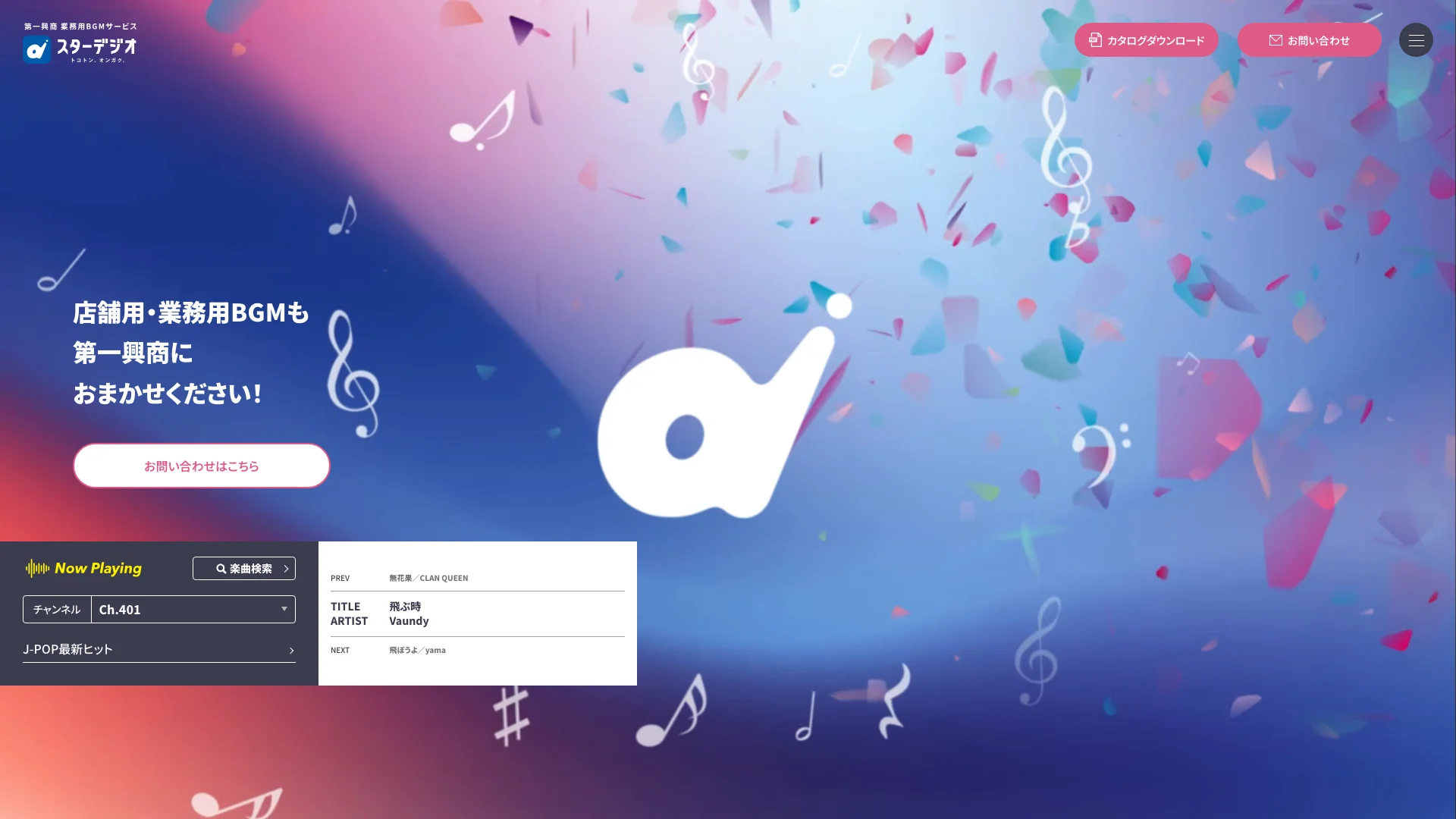 第一興商が運営。110チャンネルでJ-POP・演歌・洋楽・ジャズ・クラシック・K-POPまで幅広い。Airは専用タブレット、光はフレッツ光回線経由。月額は公式非公開(要問い合わせ/参考値:Air 4,950円・光 4,400円)。著作権処理代行。 → スターデジオ公式
